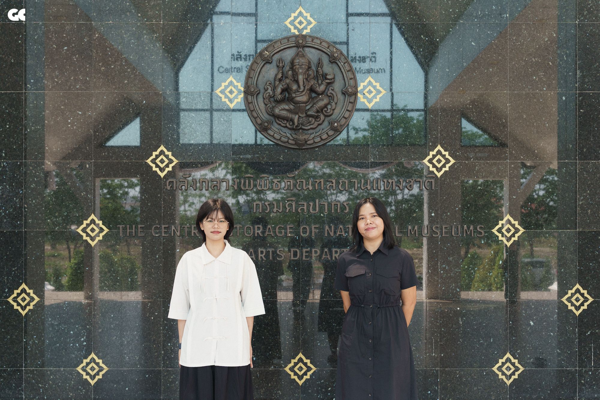 และหลังจากที่เราติดต่อไป ทางทีมคลังกลางฯ อย่าง พี่หนิง - กัญณศมนต์ ภู่ธรรม ภัณฑารักษ์ชำนาญการพิเศษ ผู้ดูแลคลังกลางพิพิธภัณฑสถานแห่งชาติ ก็ให้การสนับสนุนพวกเราอย่างเต็มที่ พร้อมส่งสองตัวแทนทีมภัณฑารักษ์และผู้ช่วยภัณฑารักษ์รุ่นใหม่ อย่าง ‘พลอย - พลอยไพลิน ปุราทะกา’ (ภัณฑารักษ์) และ ‘มิ้งค์ - ศศิกานต์ ค้าขาย’ (ผู้ช่วยภัณฑารักษ์) มาพูดคุย และพาเราไปทำความรู้จักกับการทำงานของชาวคลังกลางฯ ที่จะทำให้เราเข้าใจถึงกระบวนการคิดและวิธีการทำงานของภัณฑารักษ์แบบอินไซด์ ซึ่งทั้งสองคนให้คำนิยามสั้น ๆ ไว้ว่า คนที่จะสนุกกับการทำงานแบบนี้ อย่างน้อย ๆ ต้องเป็นคน “อยากรู้เรื่องของคนอื่น” และ “ขี้สงสัย” เข้าไว้