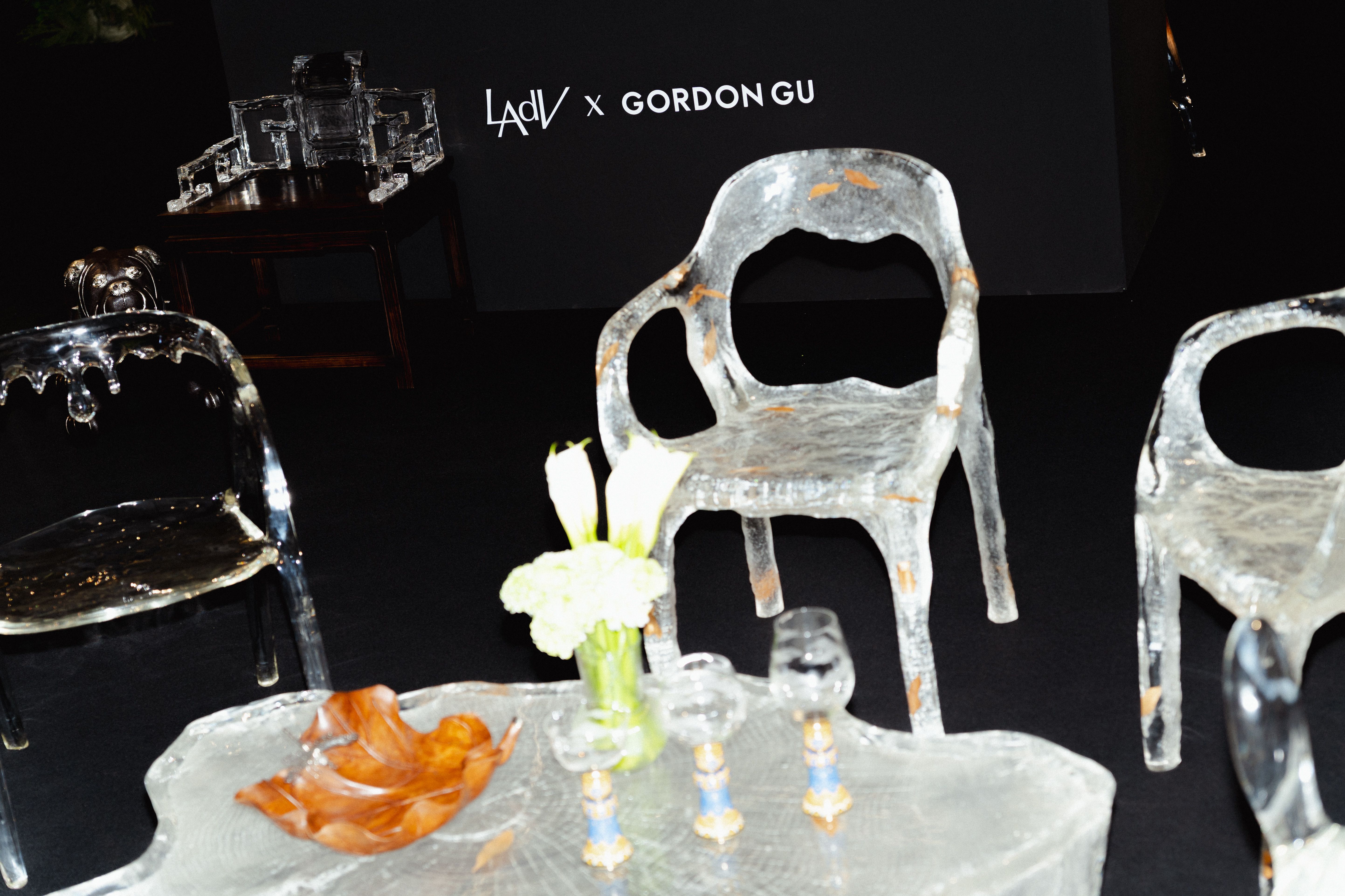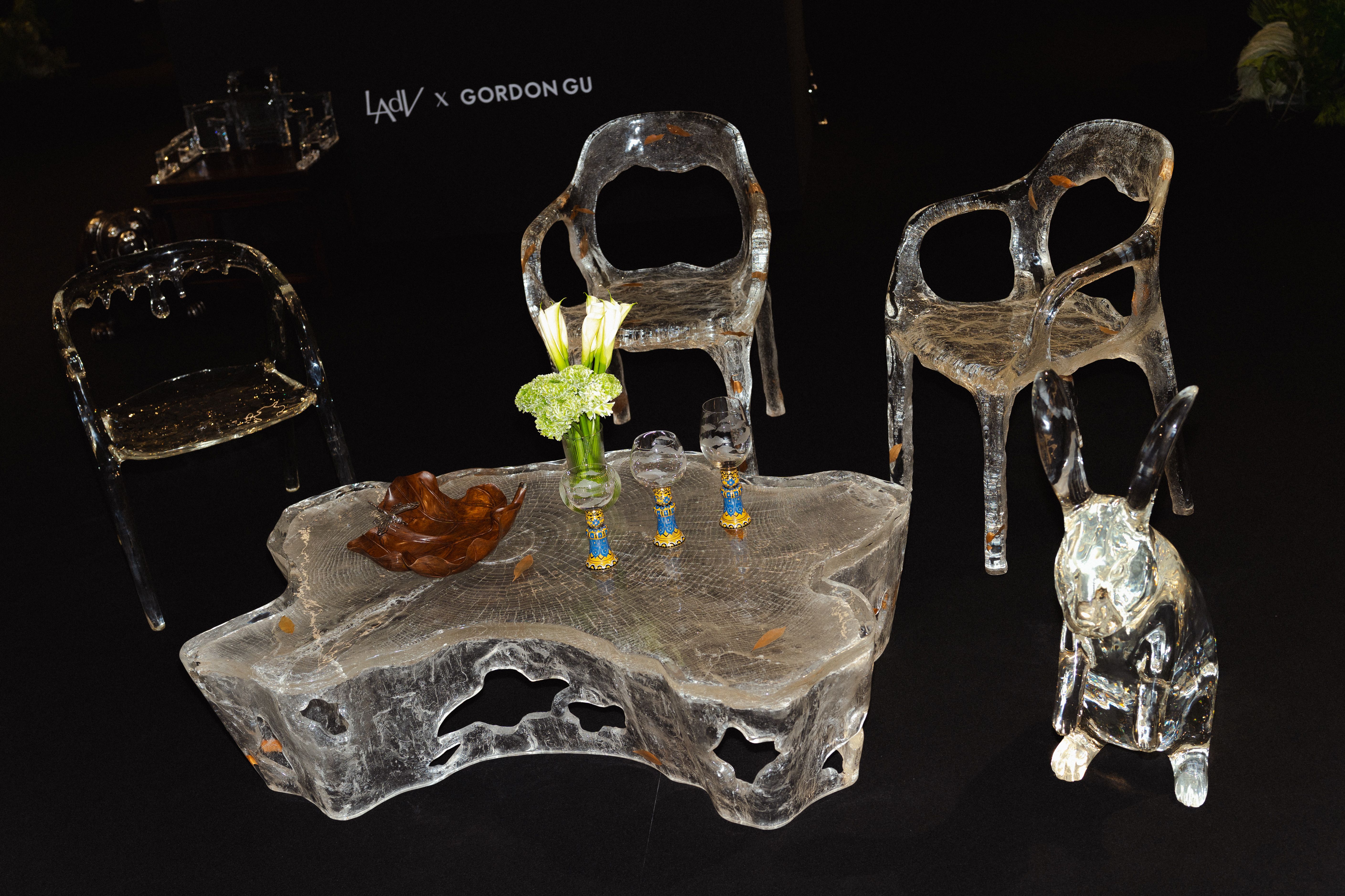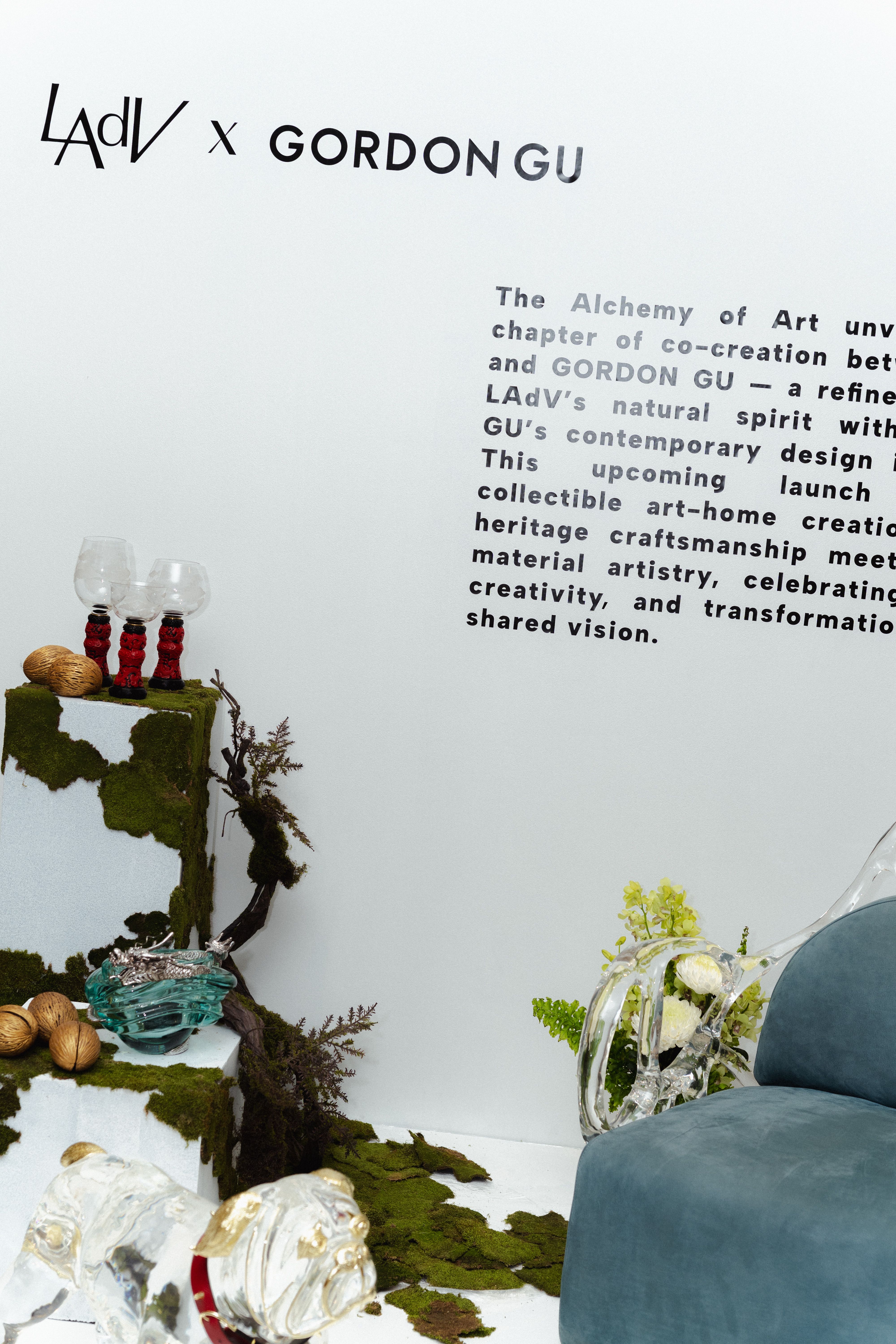 หนึ่งในจุดเด่นสำคัญของ Gordon Gu ที่ก่อตั้งโดย กู่ ไห่หลง คือวัสดุที่เขาพัฒนาขึ้นเอง วัสดุชนิดนี้เป็นเรซินวิศวกรรมที่ผ่านการปรับโครงสร้างระดับโมเลกุล มีลักษณะคล้ายคริสตัล โปร่งแสง และสามารถขึ้นรูปได้อย่างอิสระ แต่ในขณะเดียวกันก็มีความแข็งแรงและเป็นมิตรต่อสิ่งแวดล้อม สำหรับ Lotus Arts de Vivre ซึ่งเป็นแบรนด์ที่มีชื่อเสียงจากการใช้วัสดุธรรมชาติ การทดลองนำวัสดุร่วมสมัยเช่นนี้มาผสมกับภาษาการออกแบบของตัวเองจึงเหมือนการเปิดพื้นที่ทดลองใหม่ การนำวัสดุจากสองโลก ทั้งโลกของธรรมชาติและโลกของเทคโนโลยี มาหลอมรวมกัน จึงกลายเป็นแนวคิดหลักของคอลเลกชัน และนำไปสู่ชื่อ “The Alchemy of Art” ซึ่งสื่อถึงกระบวนการเล่นแร่แปรธาตุ การทดลองผสมสิ่งต่าง ๆ เพื่อให้เกิดสิ่งใหม่ที่ไม่เคยมีมาก่อน