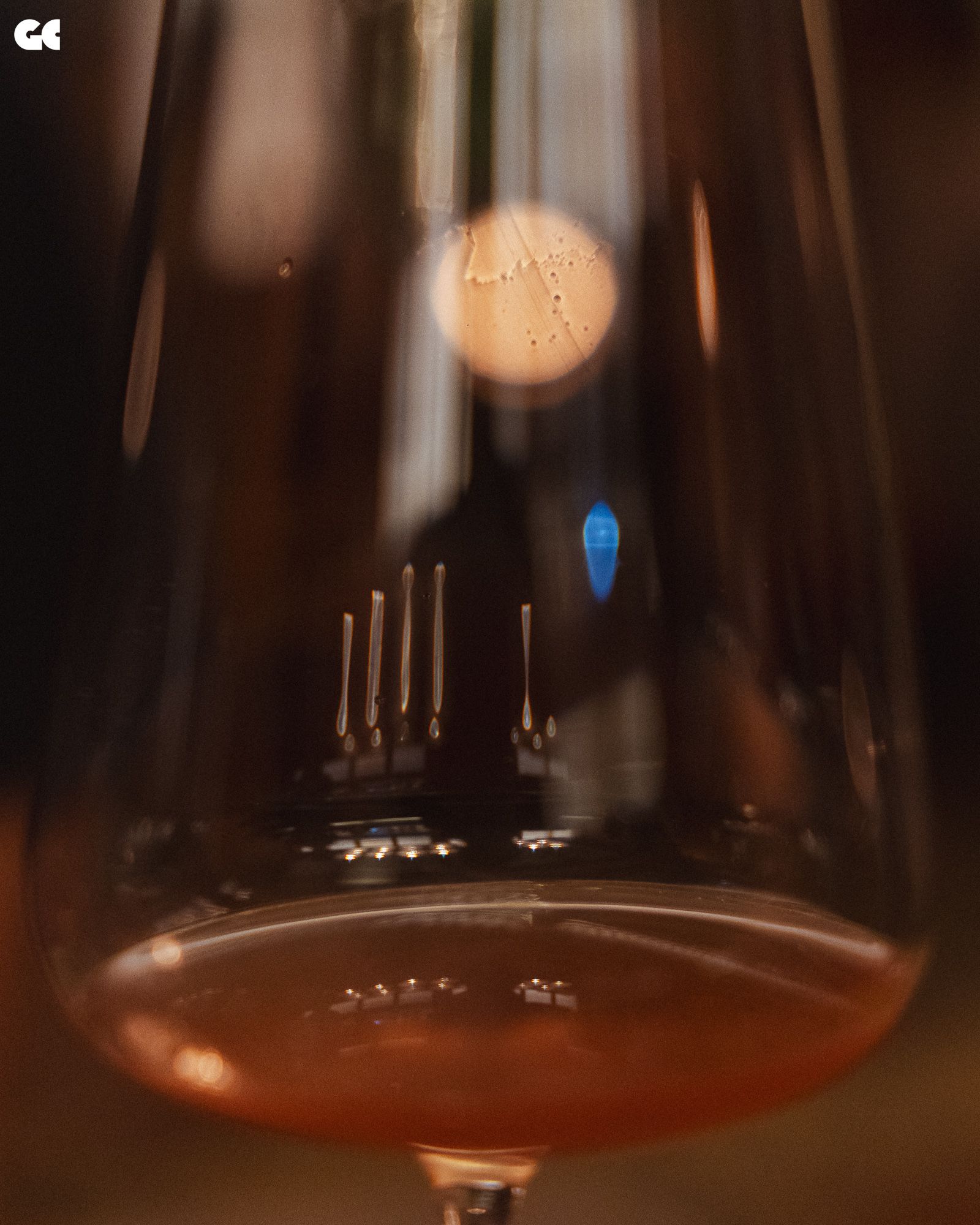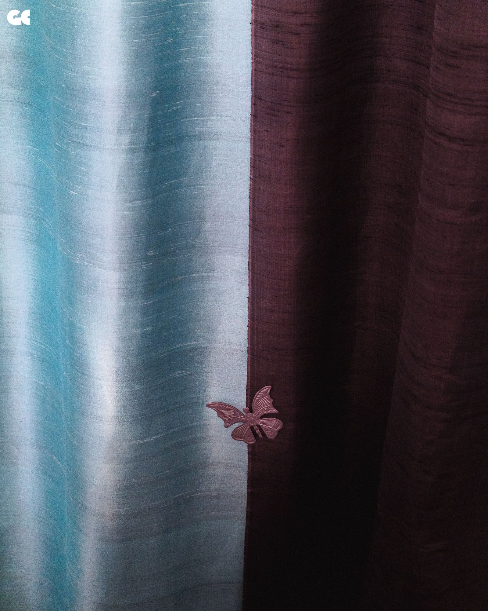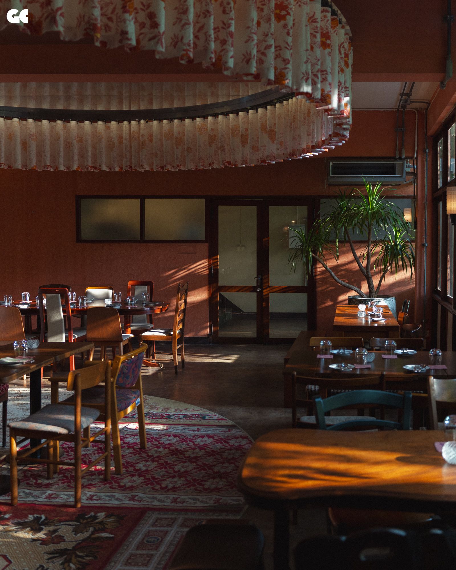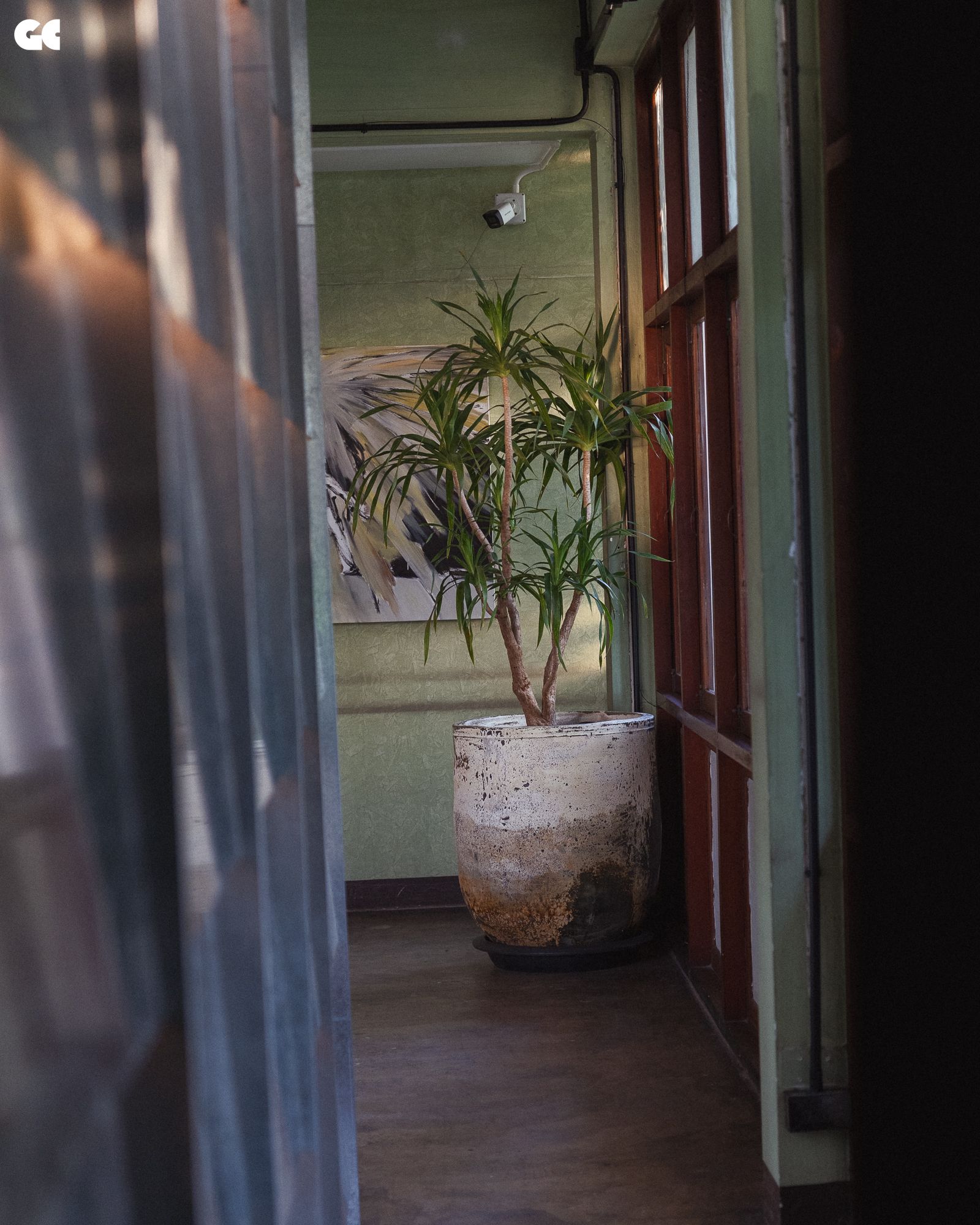 แต่ที่นี่ก็ไม่ได้มีแค่วัสดุสมัยใหม่กับรูปทรงเหลี่ยมแข็งเท่านั้น ในพื้นที่ไวน์บาร์เราจะพบอีกเสน่ห์ของดีไซน์ที่นี่ คือการผสมผสานธรรมชาติเข้าไปอย่างลงตัว ตั้งแต่ที่พรมด้านล่างจนถึงงานตกแต่งด้านบน “ดีไซน์ที่นี่จะเล่นกับแพทเทิร์นเยอะ อย่างเช่นดอกไม้ ซึ่งสอดคล้องไปกับโลโก้ที่เป็นว่านเสน่หา” วะนาเล่า