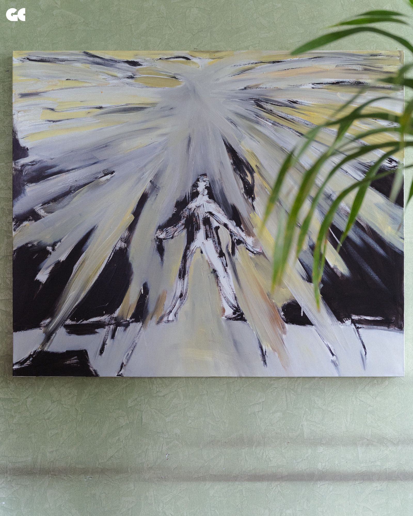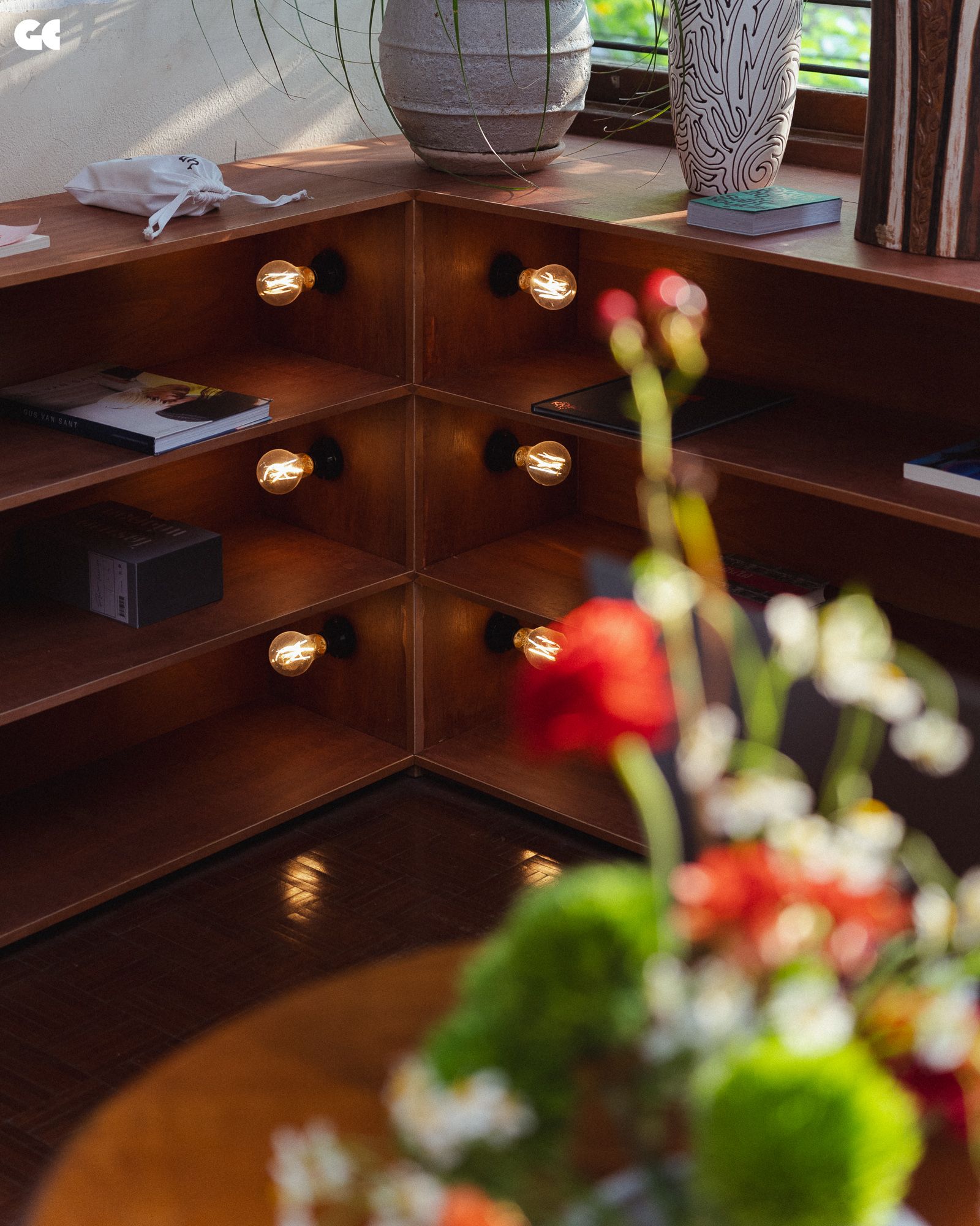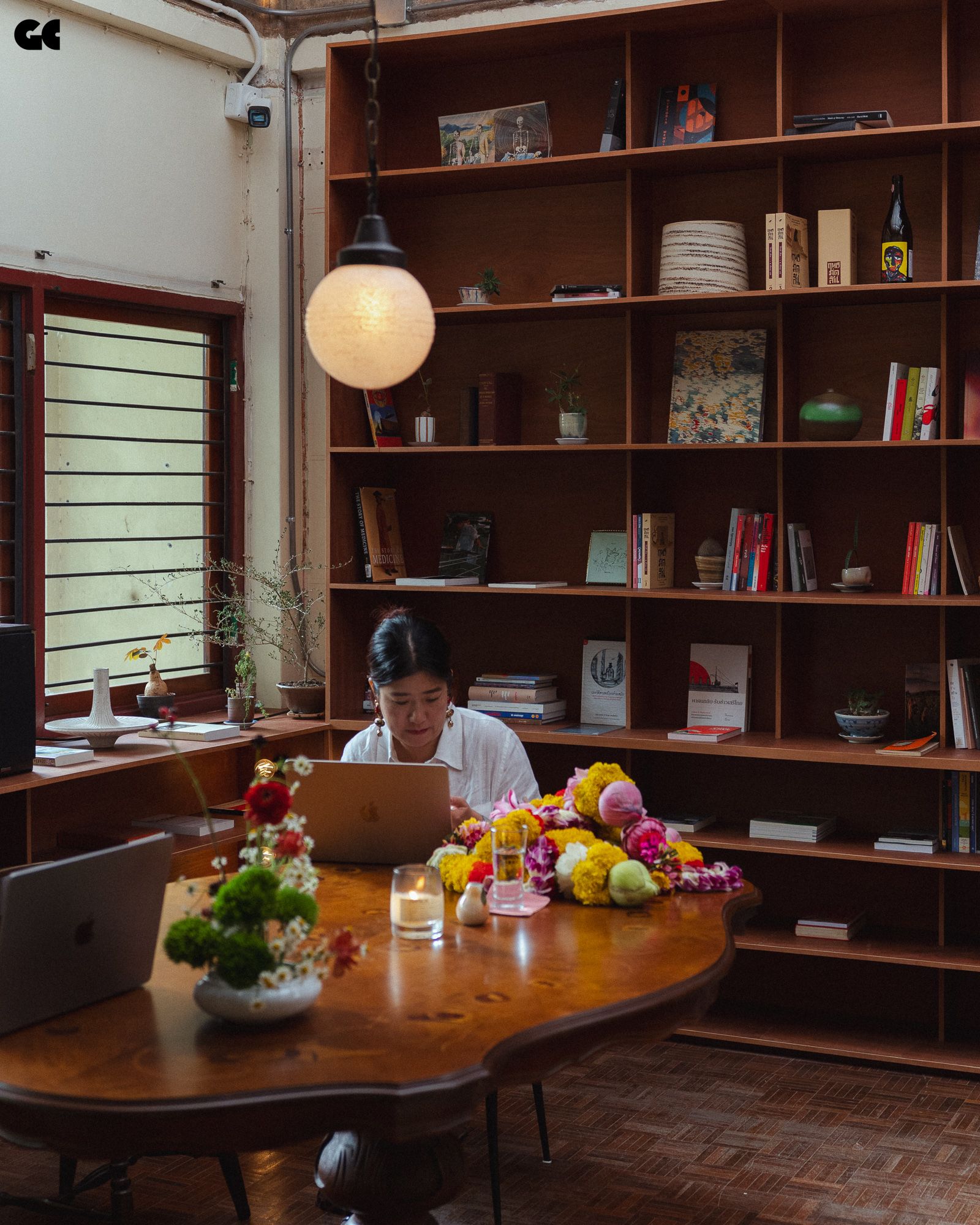 จิตวิญญาณของเขาอยู่ในต้นไม้น่ารัก ๆ ยืนต้อนรับอยู่เต็มทั้งพื้นที่ กับสีไม้น้ำตาลเข้มที่เห็นได้ทุกมุม โชคดีที่เขาคือชาวโมเดิร์นเทสต์ดีผู้มีปากเสียงเรื่องการเมืองอยู่ด้วย (คลังความคิดของเขาคือห้องสมุดที่เต็มไปด้วยหนังสือศิลปะ อย่างกับเราย่อส่วนไปอยู่ใต้กระจกใสของโต๊ะกาแฟ มีรวมบทกวีไทยที่ไร้ฉันทลักษณ์ และมี “หนังสือปกแดงต้องห้าม” สมัยใหม่ ซึ่งเราก็ไม่แน่ใจสถานะ “วัตถุต้องห้าม” ของมันเหมือนกัน รวมทั้งหนังสือสำเนียงวิพากษ์จำนวนมากของ Illuminations Editions)