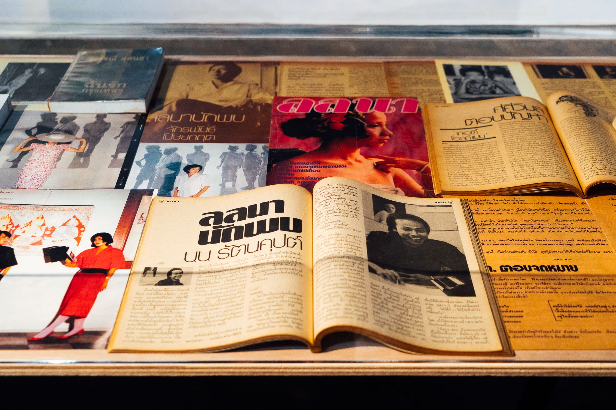 นิตยสาร ลลนา ที่สุวรรณีก่อตั้งในปี พ.ศ. 2515 ปรากฏขึ้นในพื้นที่นิทรรศการผ่านภาพถ่ายสีสดซึ่งถูกขยายจนเต็มผนัง พร้อมเอกสารและหลักฐานอีกมากที่เปิดให้ผู้ชมเข้าไปอ่านอย่างใกล้ชิด ในสายตาแรก สิ่งเหล่านี้ดูสอดคล้องกับภาษาของ “ความทันสมัย” อย่างที่เราคุ้นเคย แต่เมื่อมองลึกลงไป เราจะสัมผัสได้ถึงอุณหภูมิทางการเมืองของยุคสงครามเย็นและบรรยากาศของสังคมอำนาจนิยมที่แทรกอยู่ภายใน